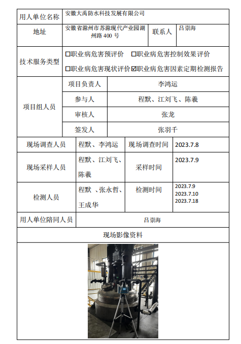 安徽大禹防水科技发展有限公司2023年职业病危害因素定期检测