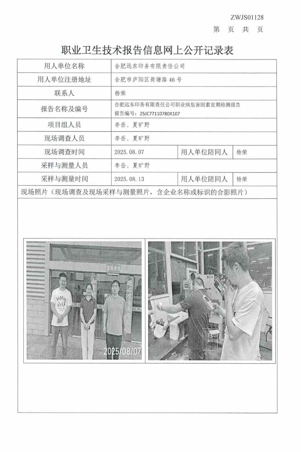 合肥远东印务有限责任公司职业病危害因素定期检测报告