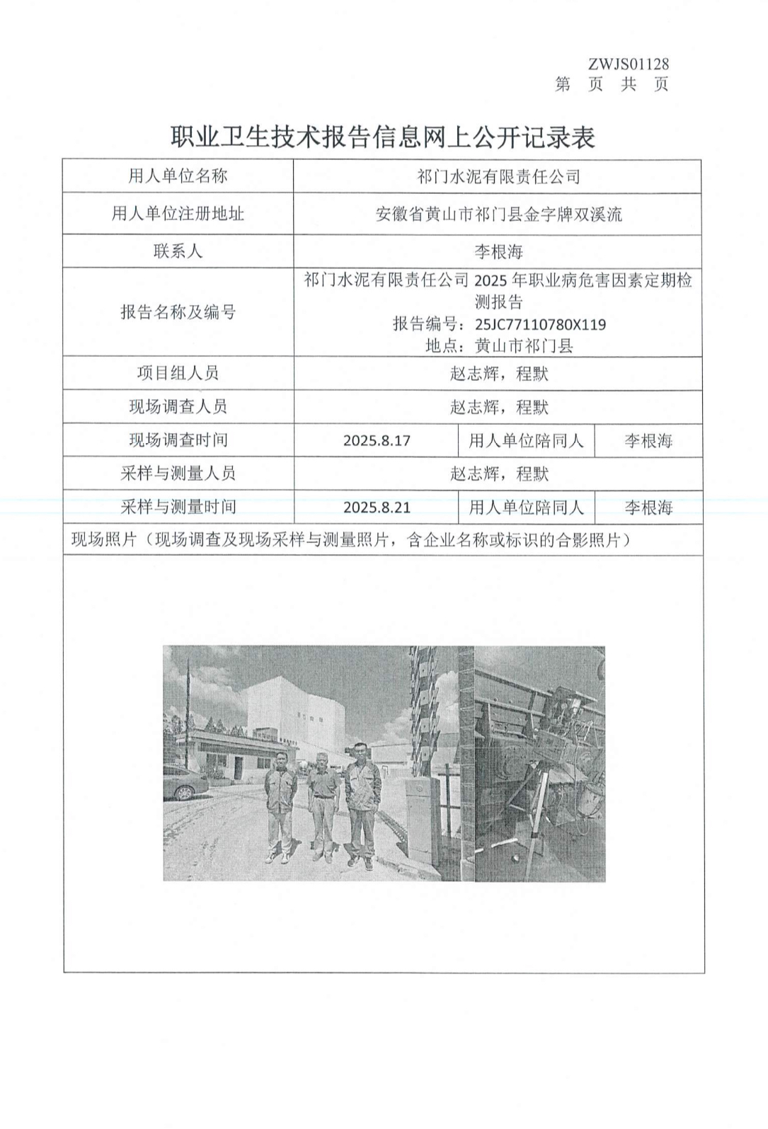 祁门水泥有限责任公司2025年职业病危害因素定期检测报告