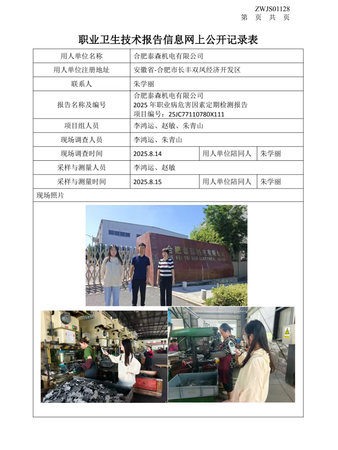 合肥泰森机电有限公司2025年职业病危害因素定期检测报告