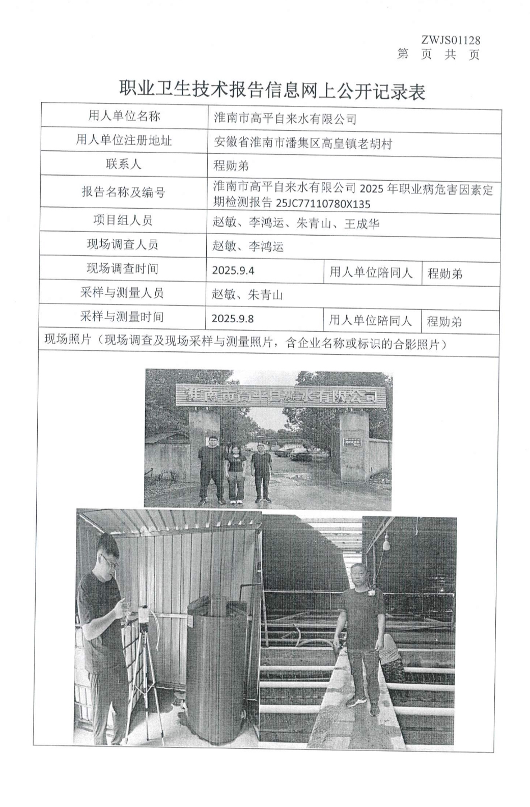 淮南市高平自来水有限公司2025年职业病危害因素定期检测报告