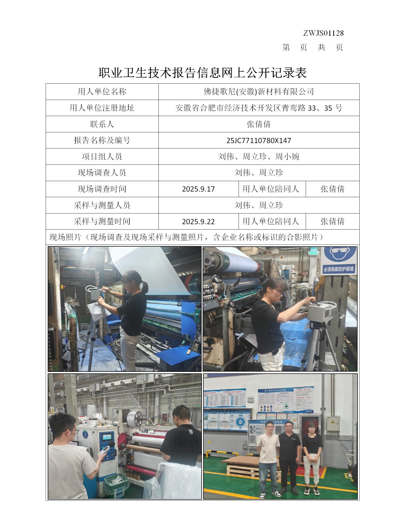 佛捷歌尼(安徽)新材料有限公司职业病危害因素定期检测报告