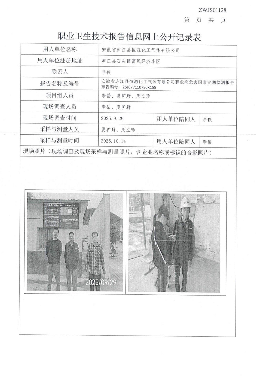安徽省庐江县恒源化工气体有限公司职业病危害因素定期检测报告