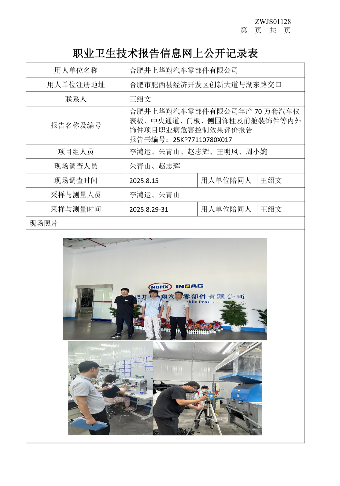 合肥井上华翔汽车零部件有限公司年产70万套汽车仪表板、中央通道、门板、侧围饰柱及前舱装饰件等内外饰件项目职业病危害控制效果评价报告