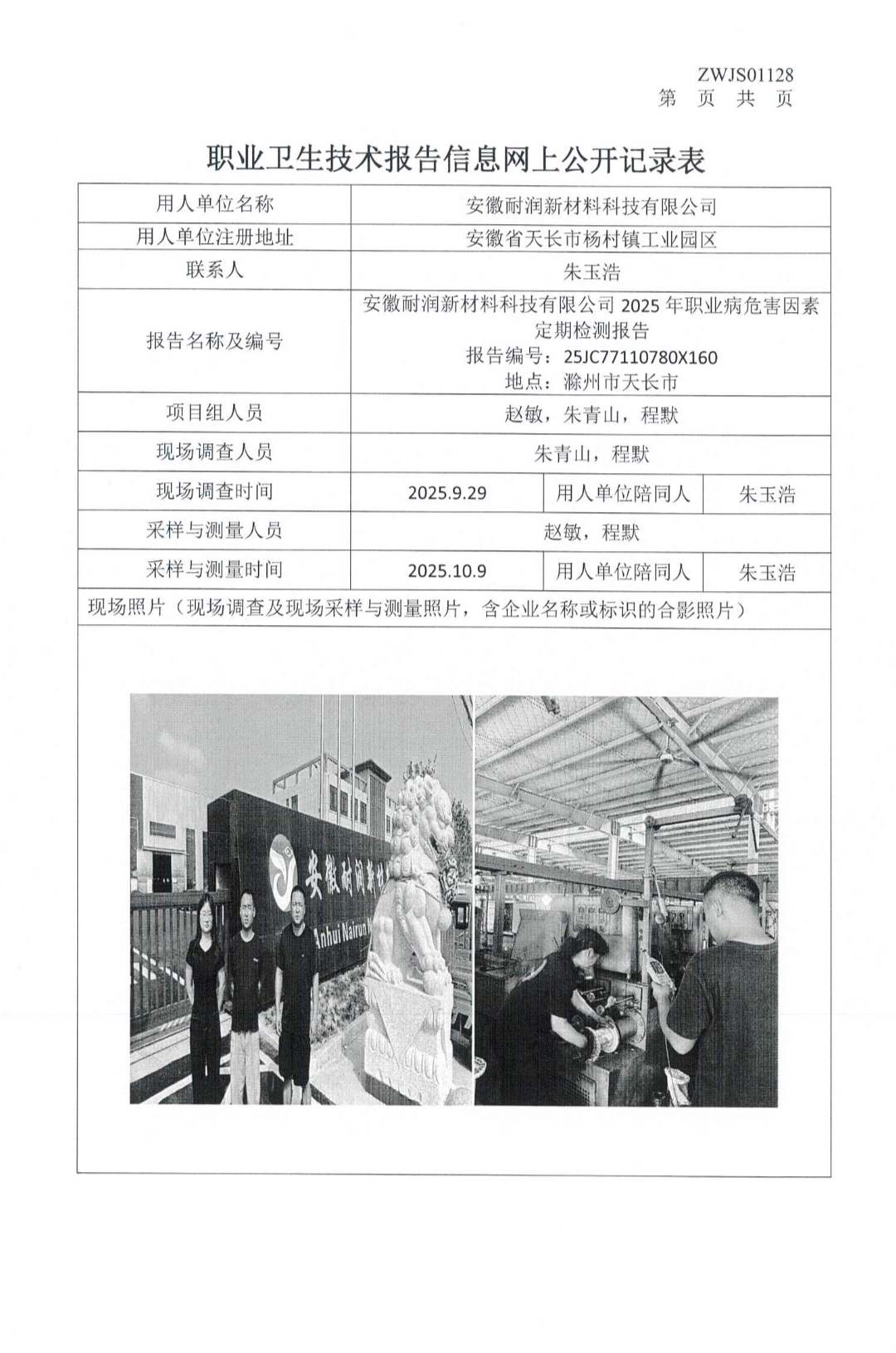 安徽耐润新材料科技有限公司2025年职业病危害因素定期检测报告