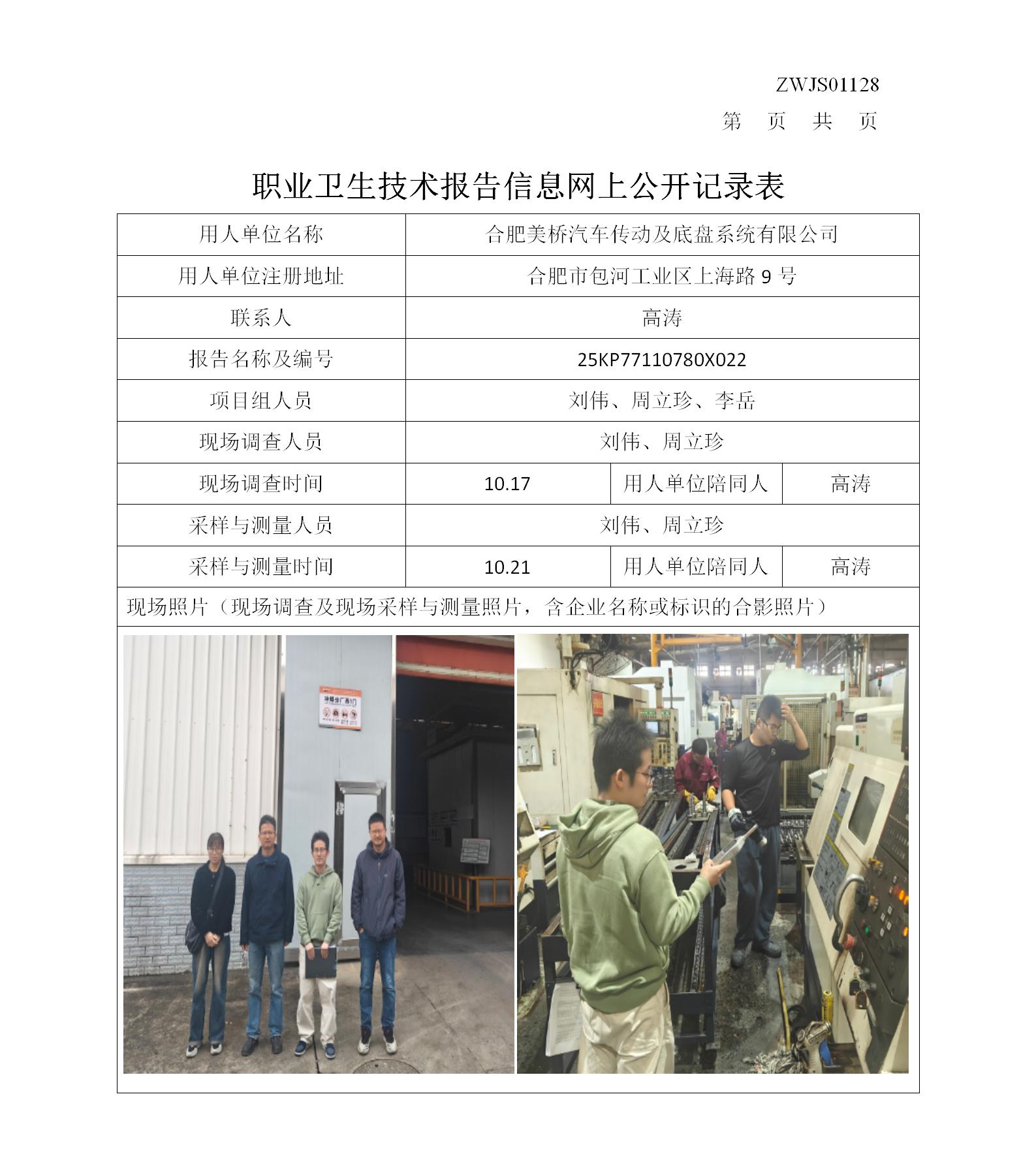 合肥美桥汽车传动及底盘系统有限公司职业病危害控制效果评价报告