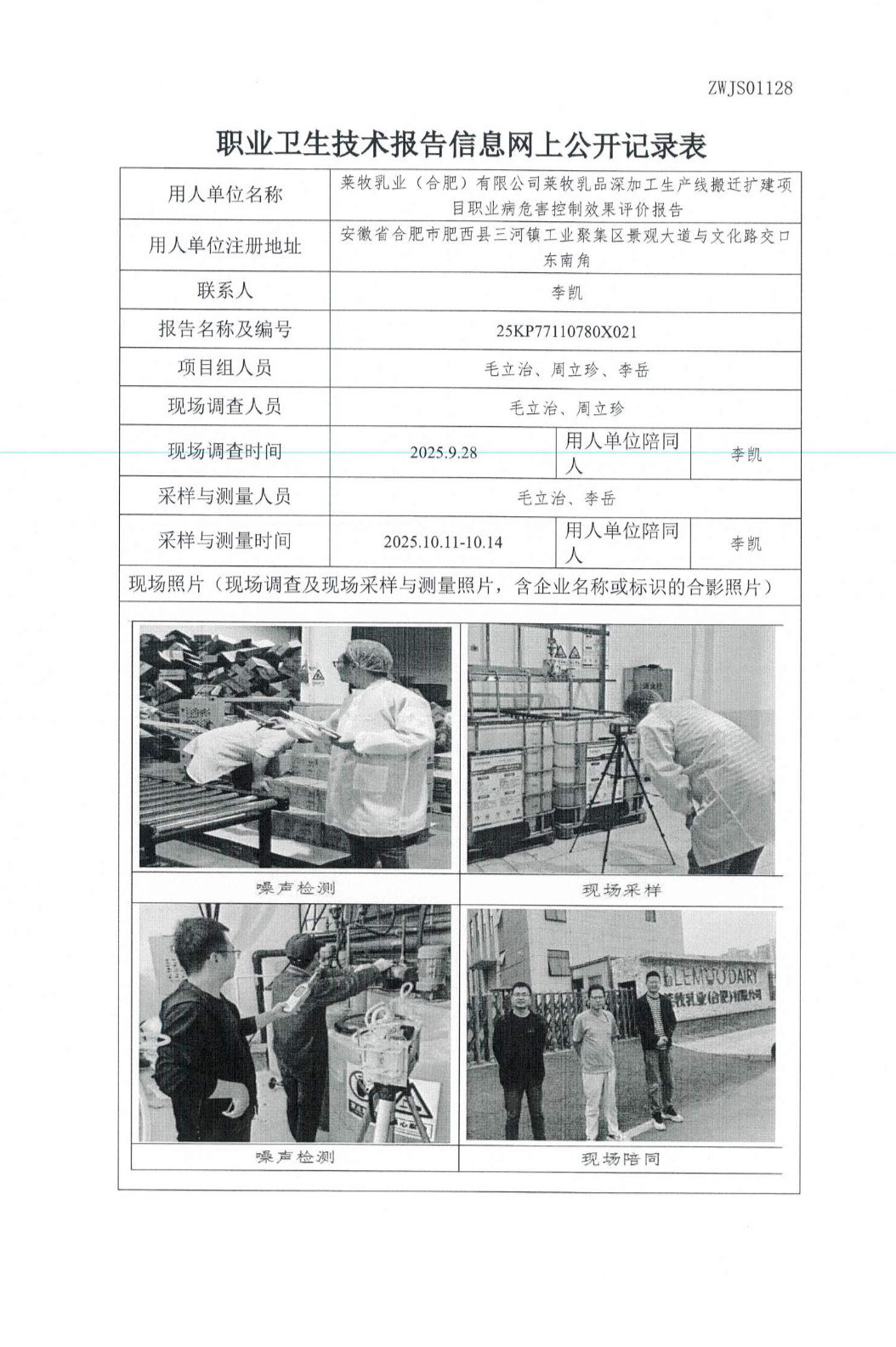 莱牧乳业(合肥)有限公司莱牧乳品深加工生产线搬迁扩建项目职业病危害控制效果评价报告