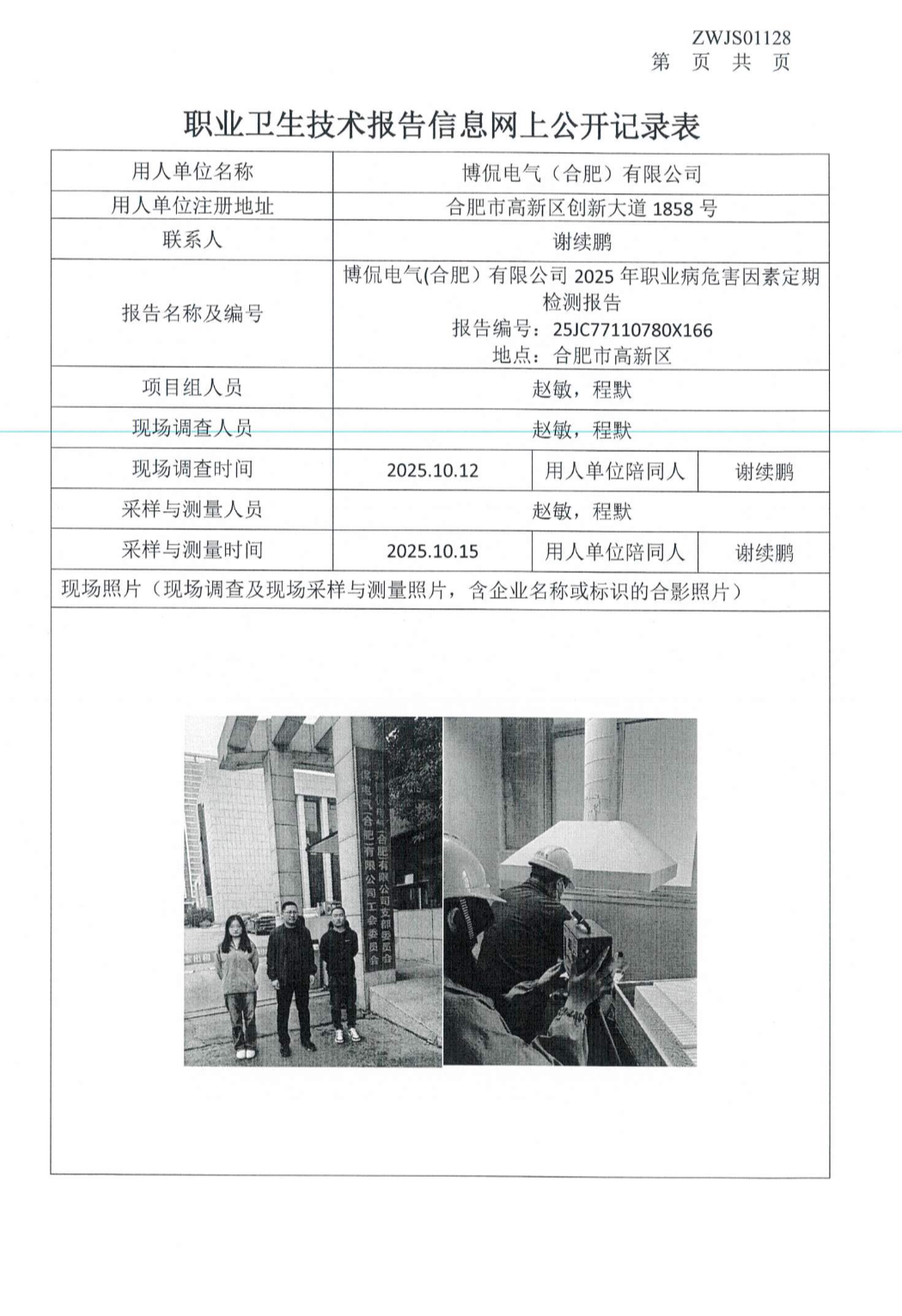 博侃电气(合肥)有限公司2025年职业病危害因素定期检测报告