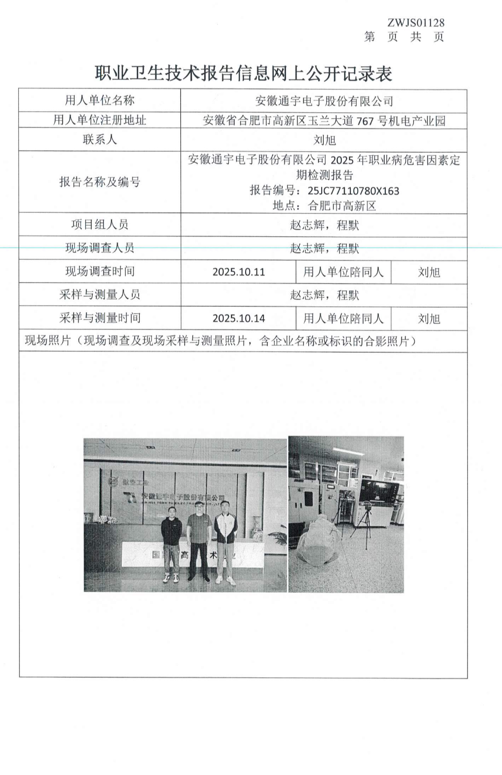 安徽通宇电子股份有限公司2025年职业病危害因素定期检测报告