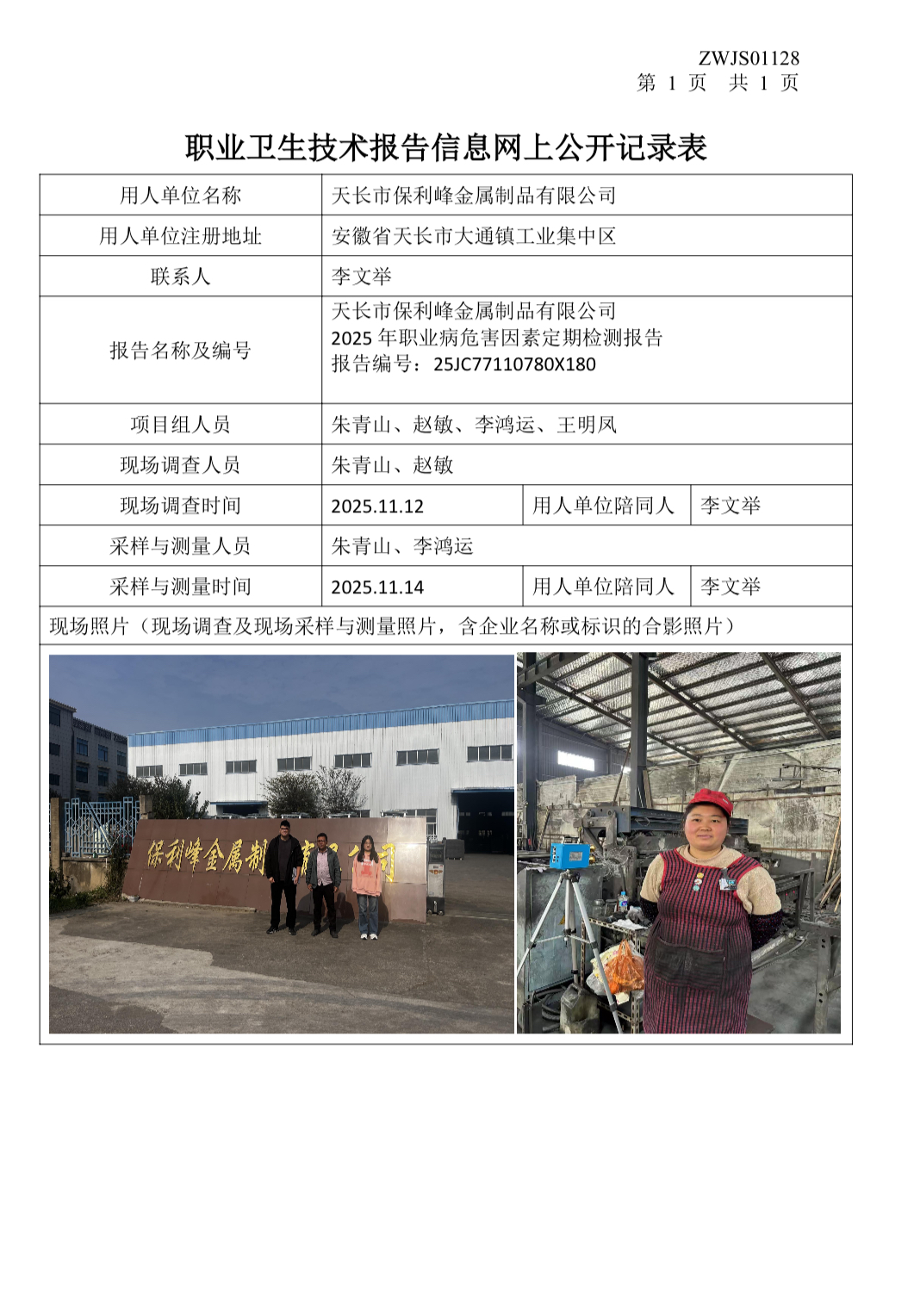 天长市保利峰金属制品有限公司2025年职业病危害因素定期检测报告