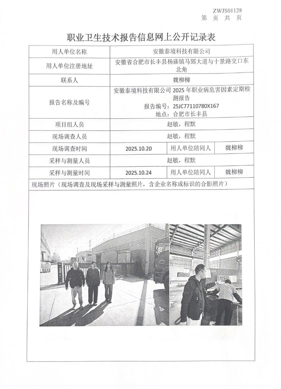 安徽泰境科技有限公司2025年职业病危害因素定期检测报告