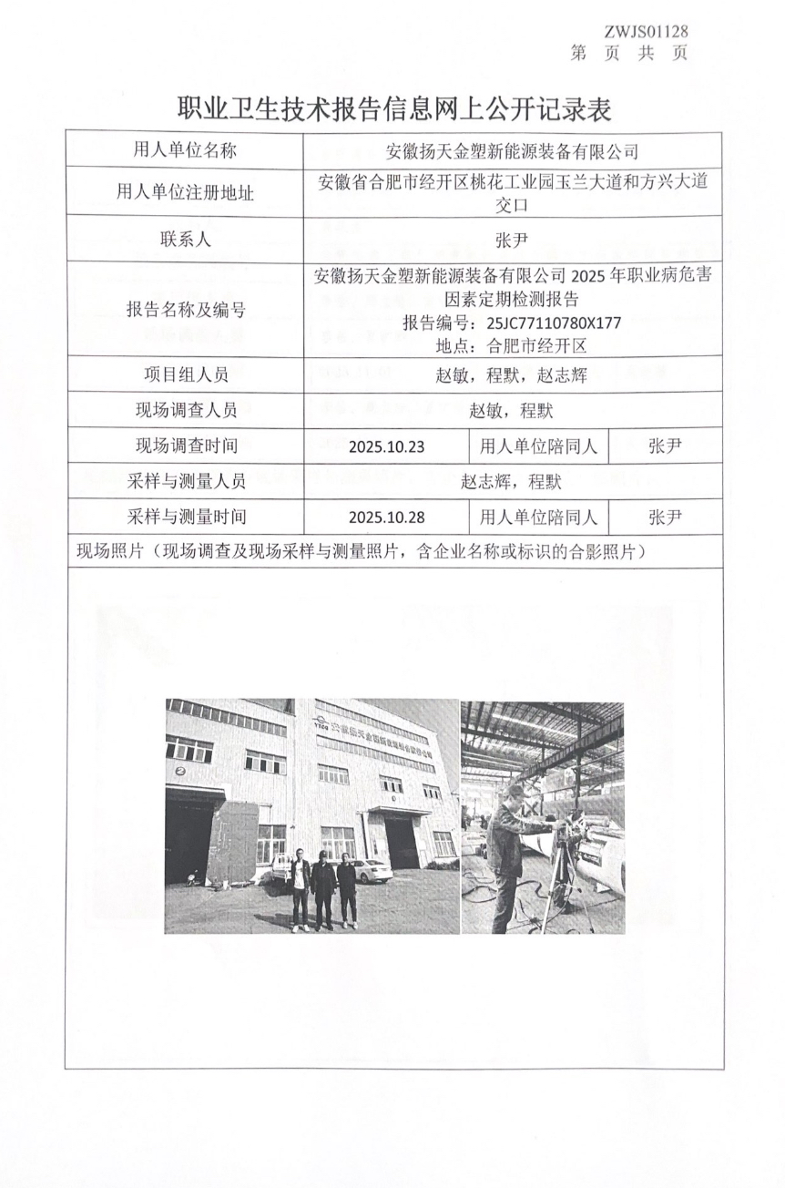 安徽扬天金塑新能源装备有限公司2025年职业病危害因素定期检测报告