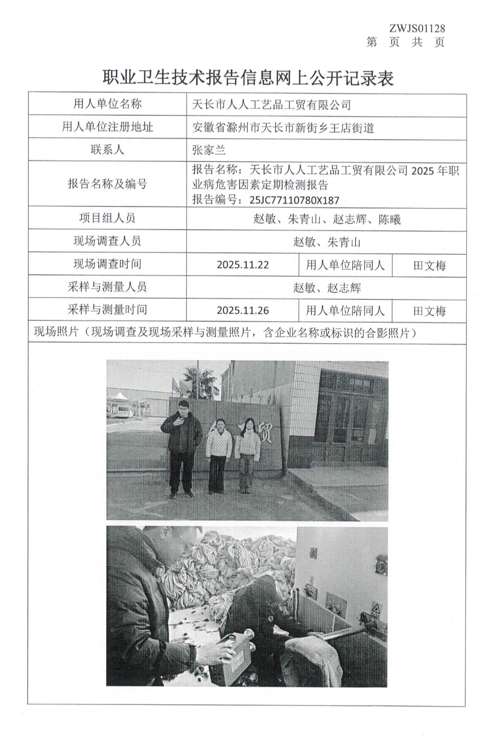 天长市人人工艺品工贸有限公司2025年职业病危害因素定期检测报告