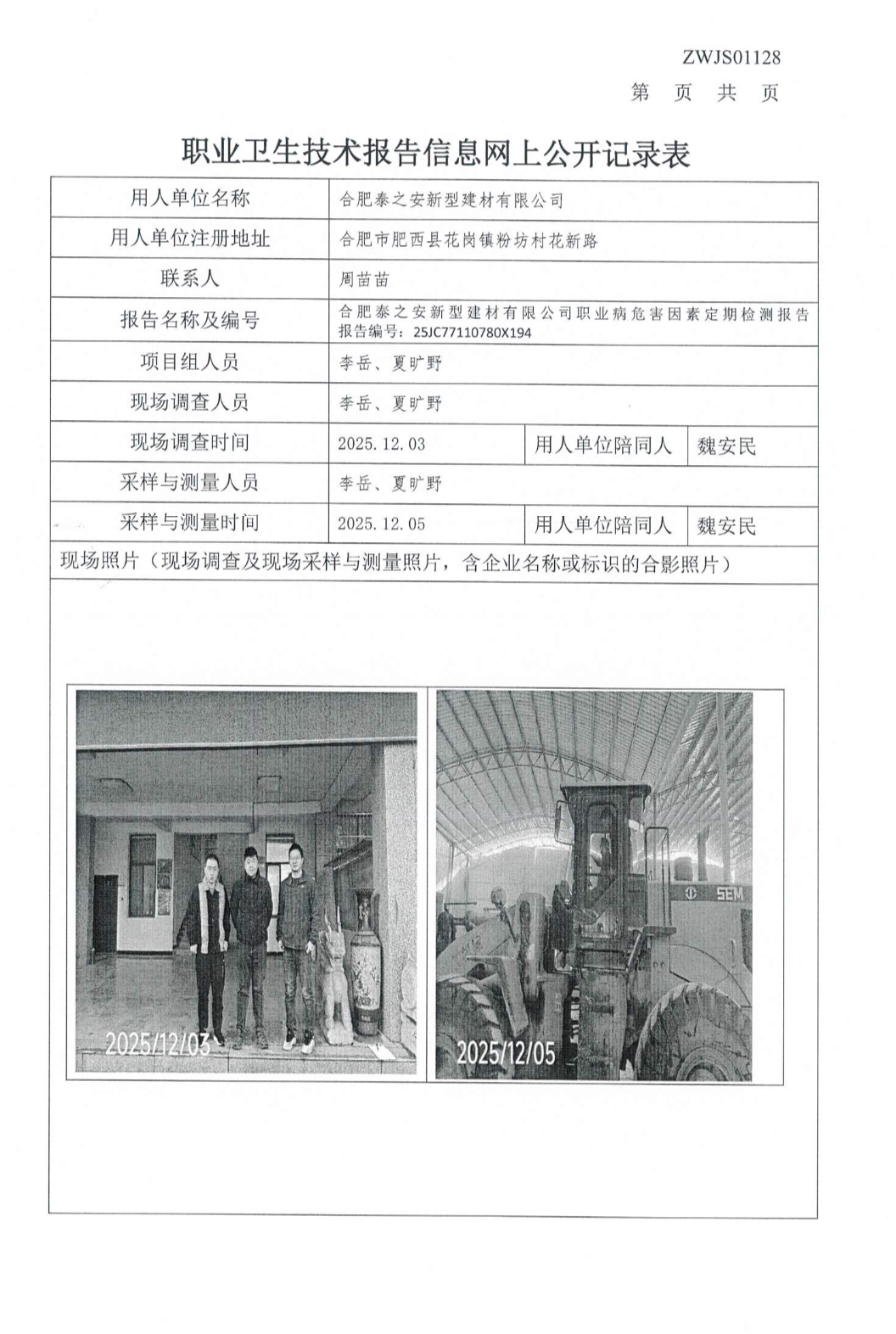 合肥泰之安新型建材有限公司职业病危害因素定期检测报告