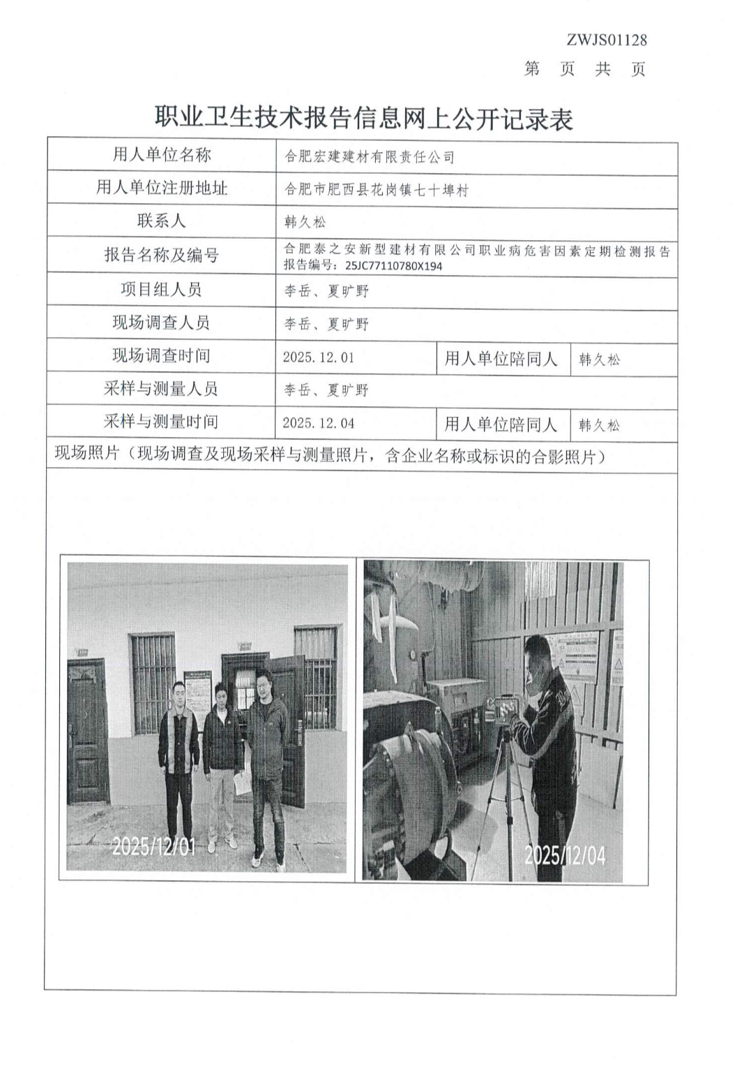 合肥泰之安新型建材有限公司职业病危害因素定期检测报告