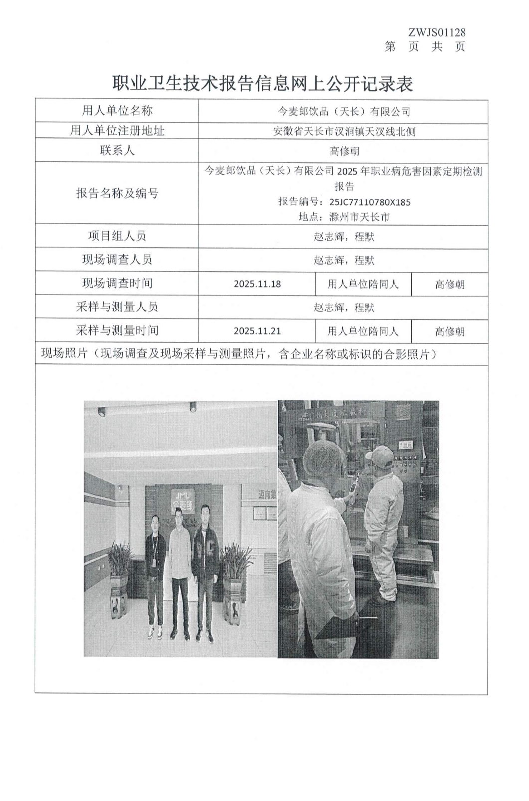 今麦郎饮品(天长)有限公司2025年职业病危害因素定期检测报告