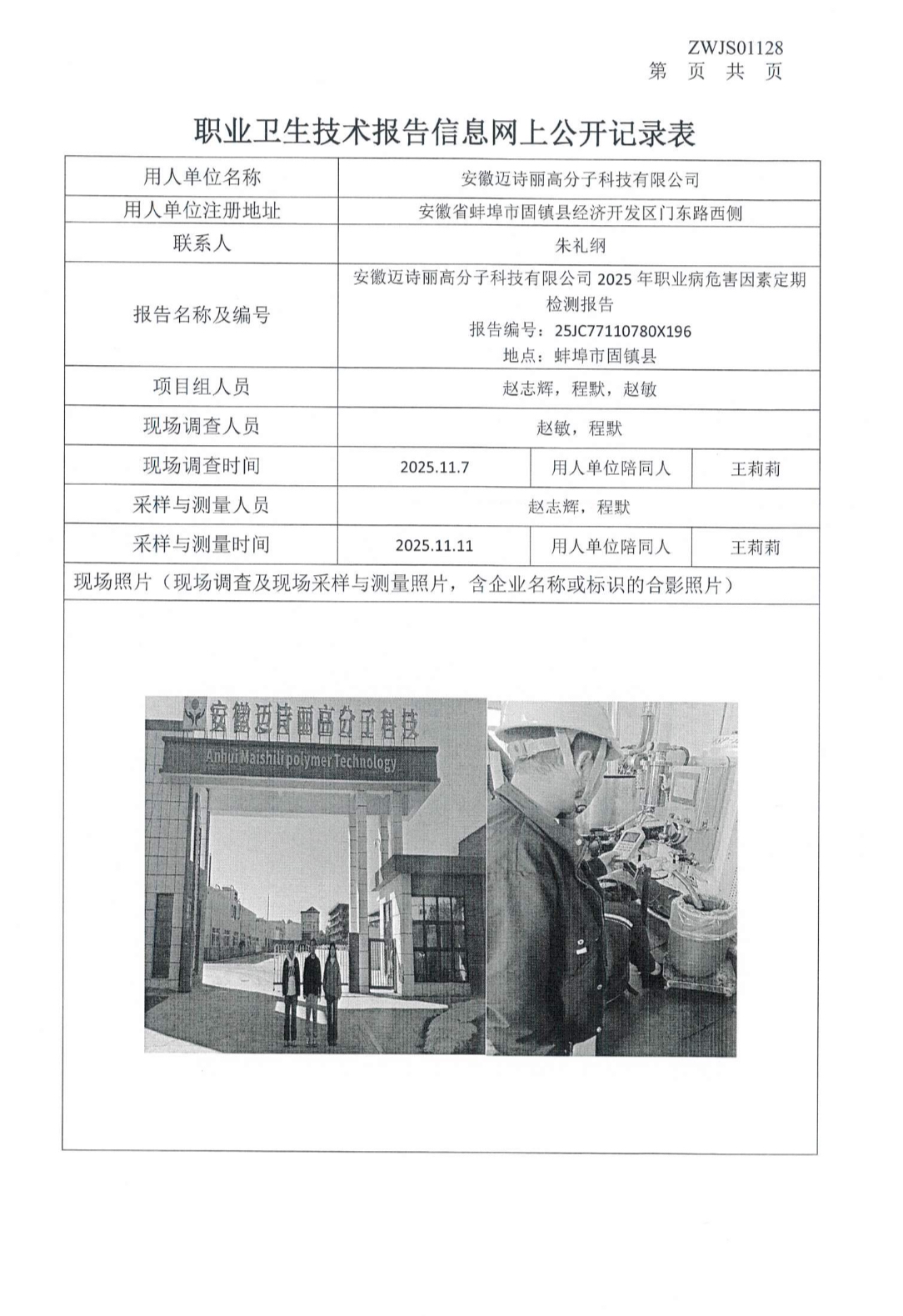 安徽迈诗丽高分子科技有限公司2025年职业病危害因素定期检测报告