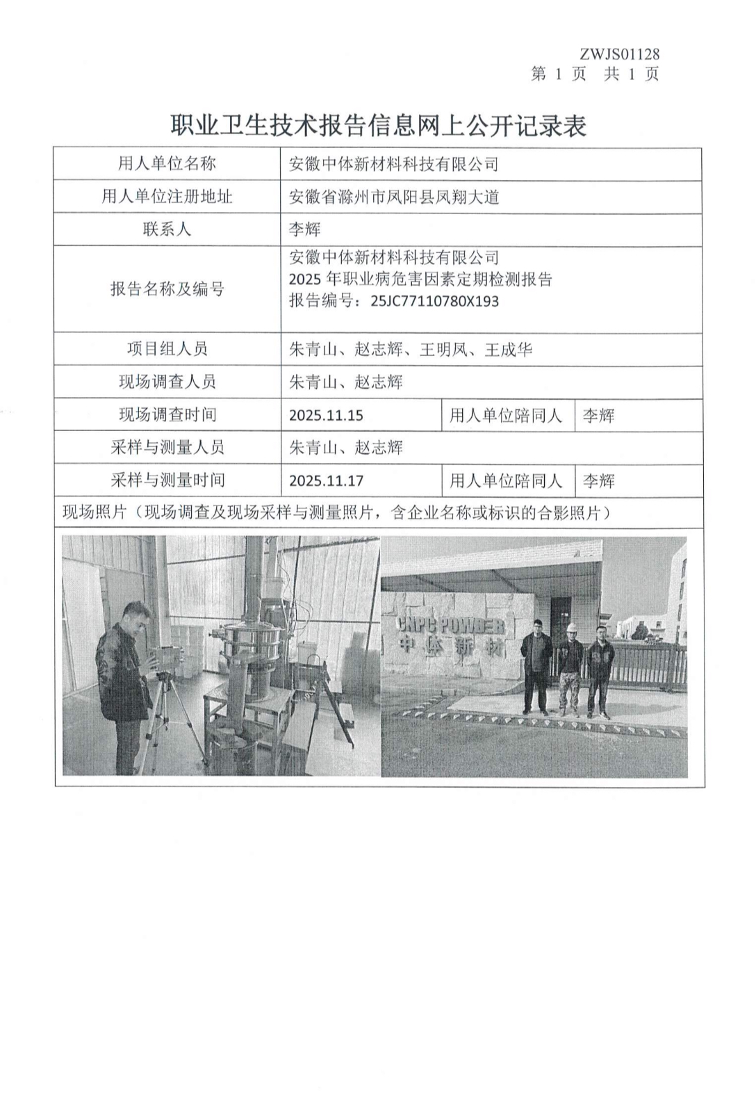安徽中体新材料科技有限公司2025年职业病危害因素定期检测报告