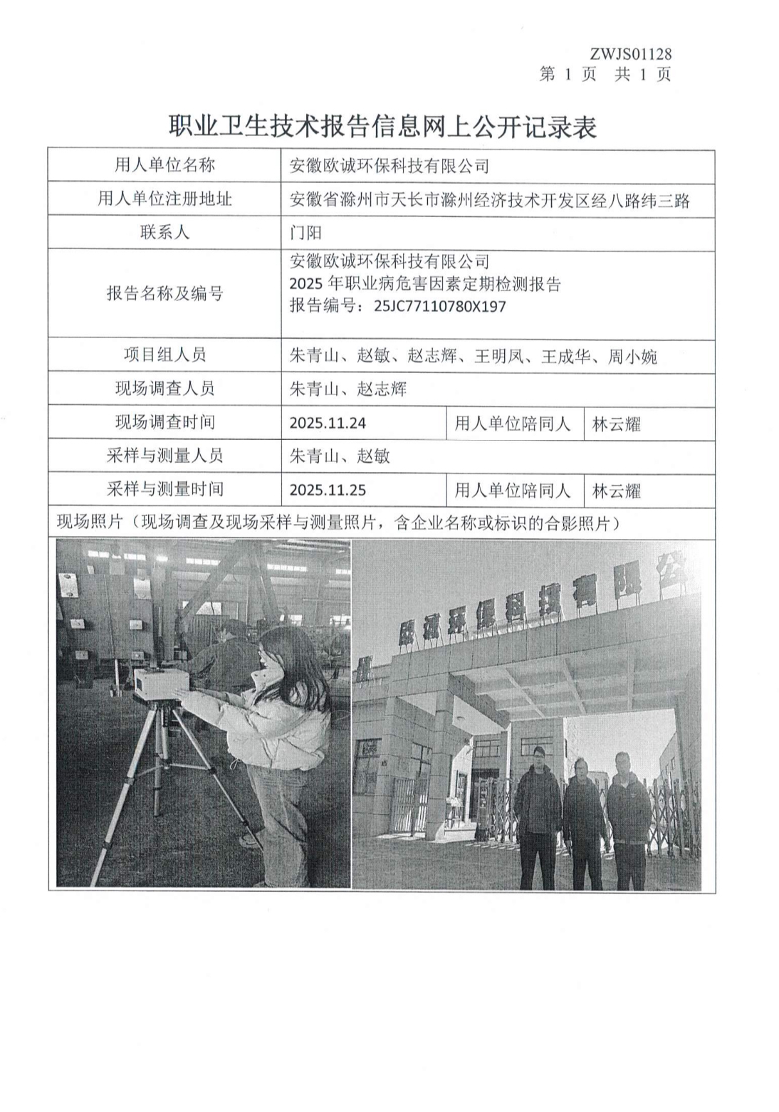 安徽欧城环保科技有限公司2025年职业病危害因素定期检测报告