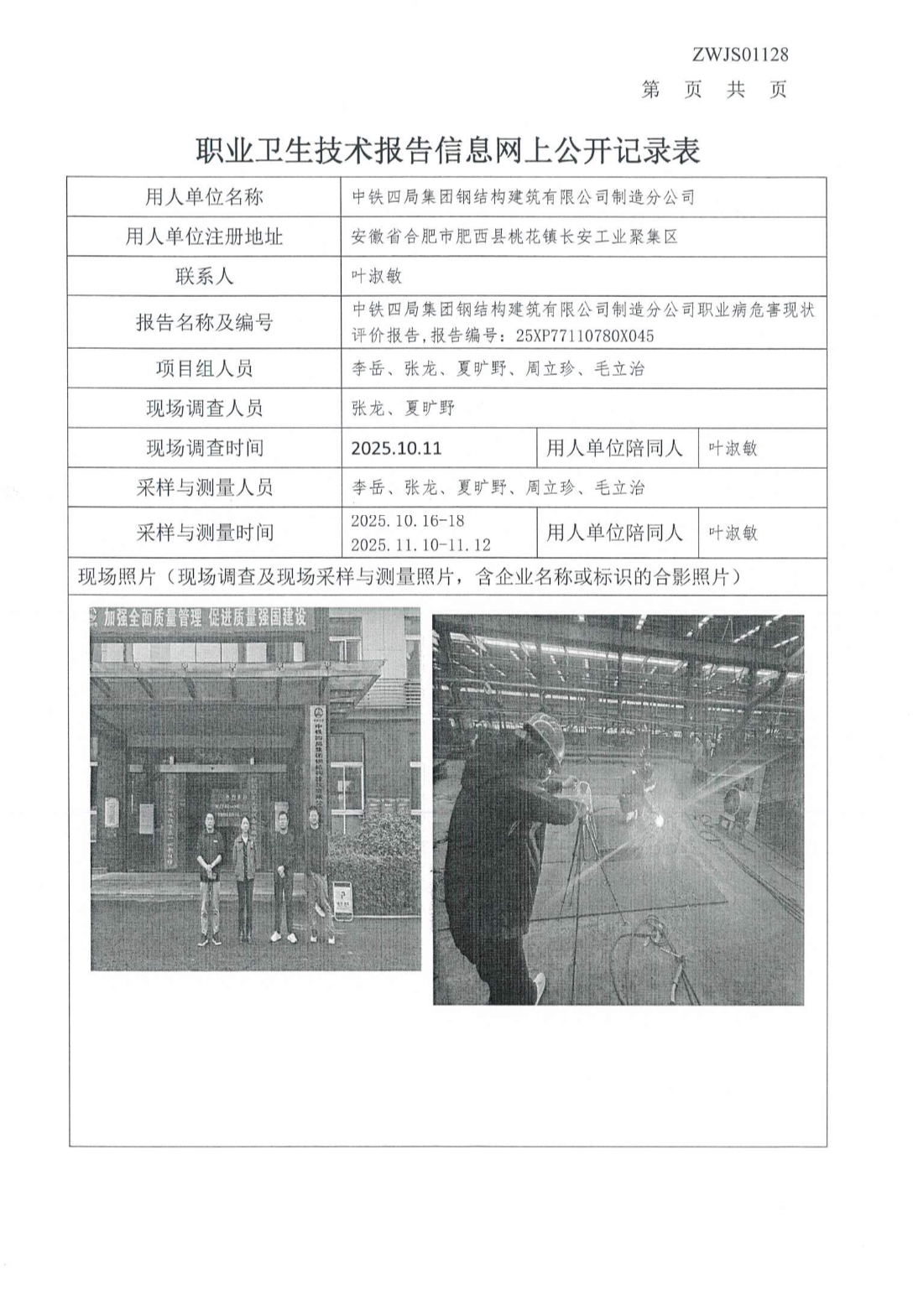 中铁四局集团钢结构建筑有限公司制造分公司职业病危害现状评价报告