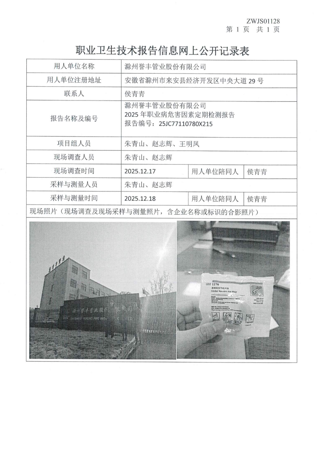 滁州誉丰管业股份有限公司2025年职业病危害因素定期检测报告