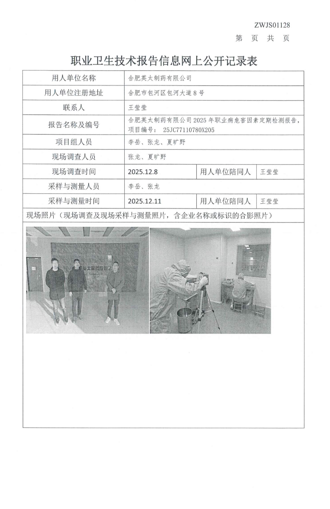 合肥英太制药有限公司2025年职业病危害因素定期检测报告