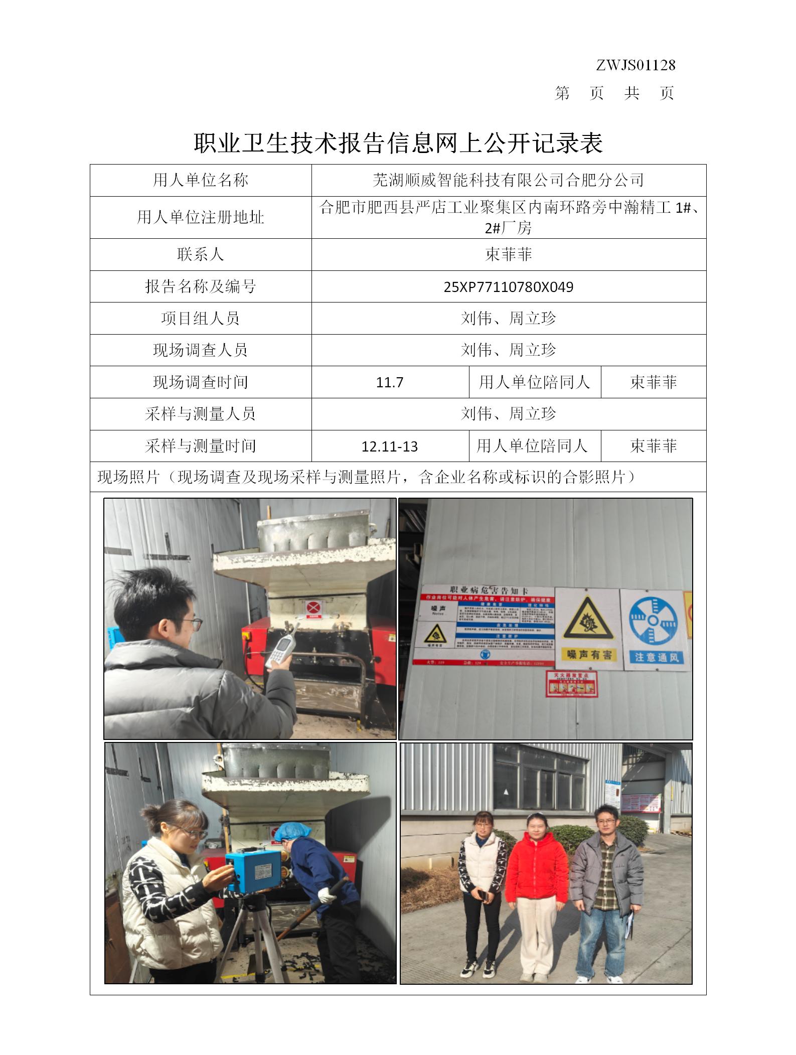 芜湖顺威智能科技有限公司合肥分公司职业病危害现状评价报告