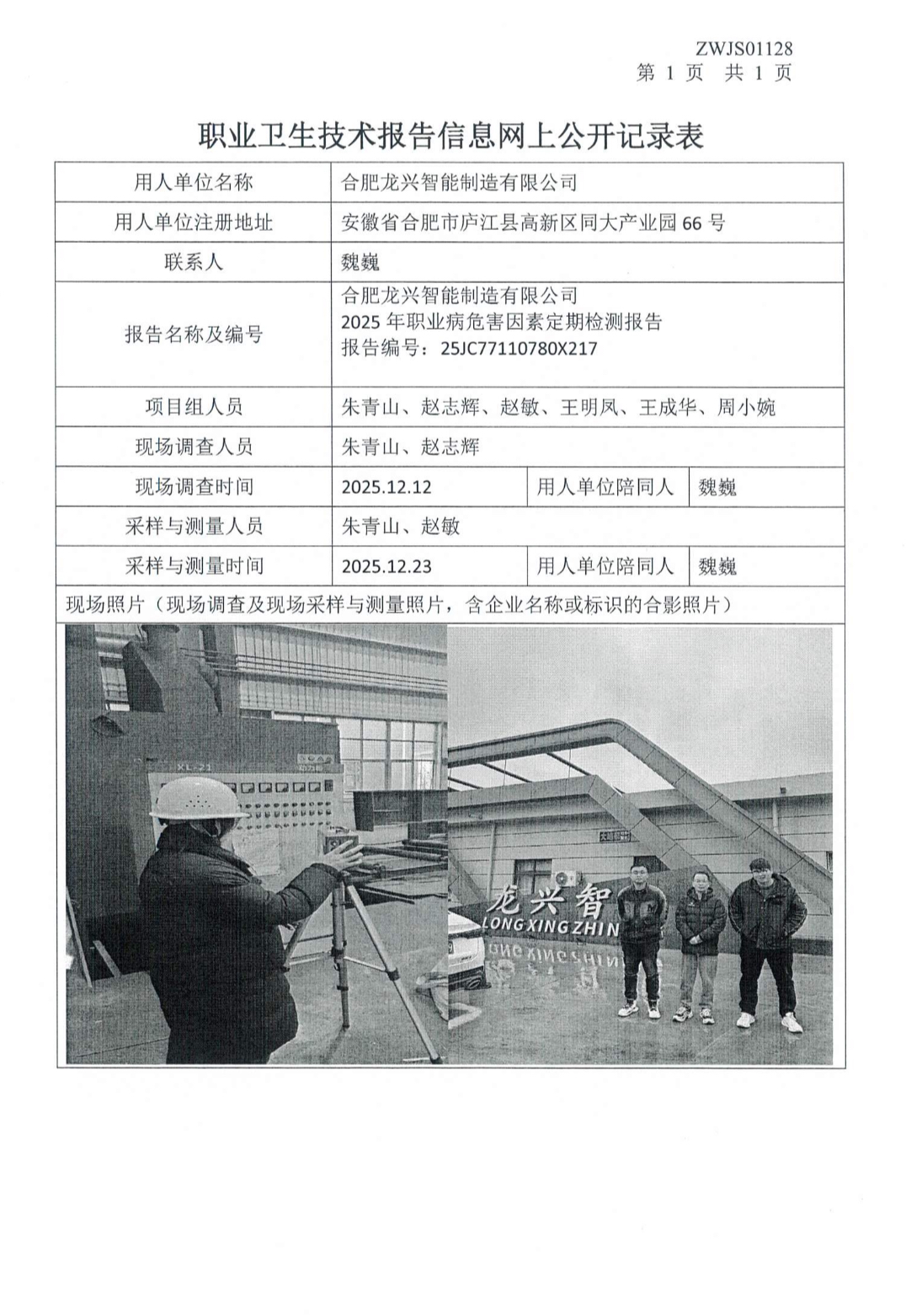 合肥龙兴智能制造有限公司2025年职业病危害因素定期检测报告
