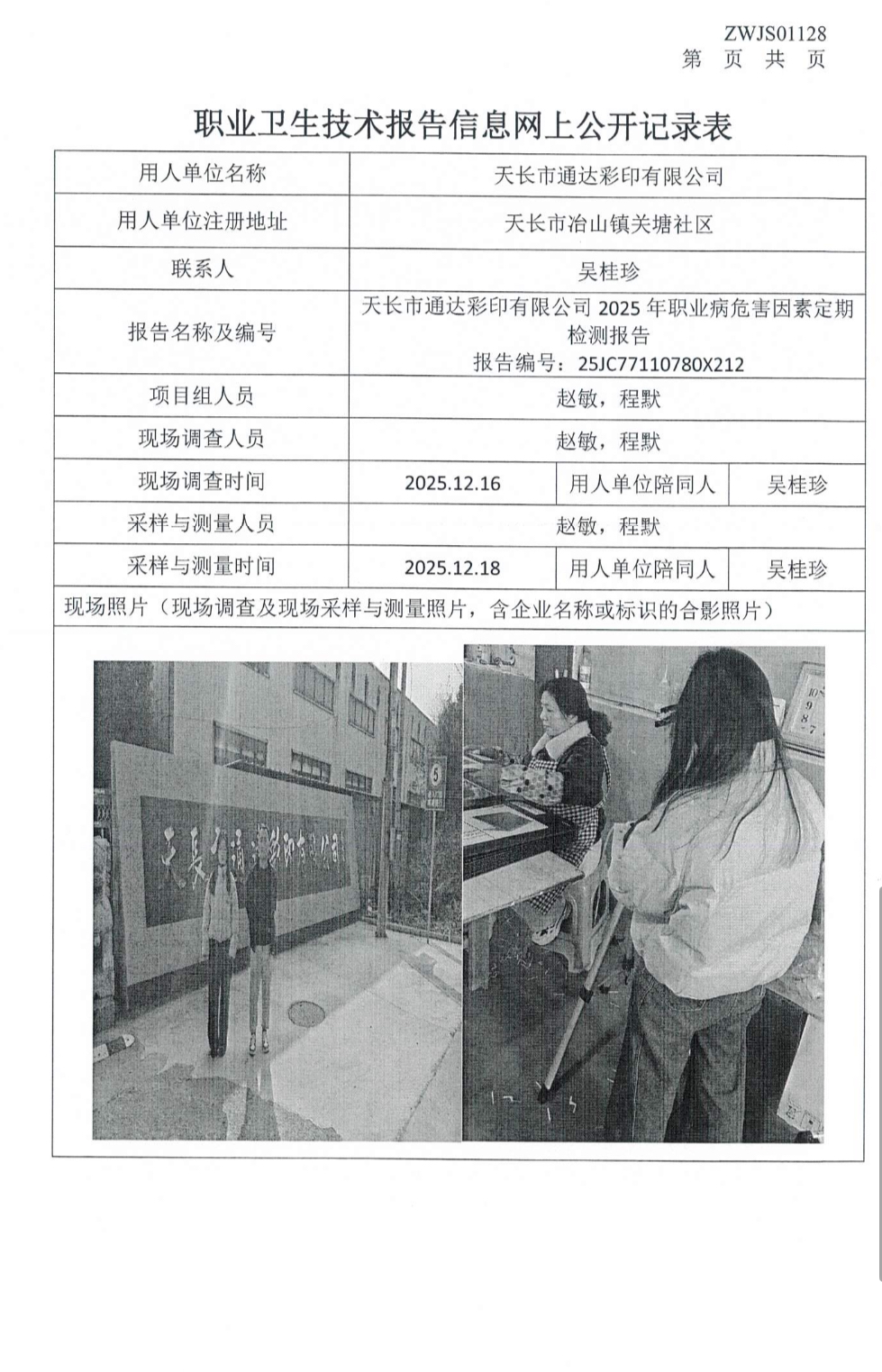 天长市通达彩印有限公司2025年职业病危害因素定期检测报告