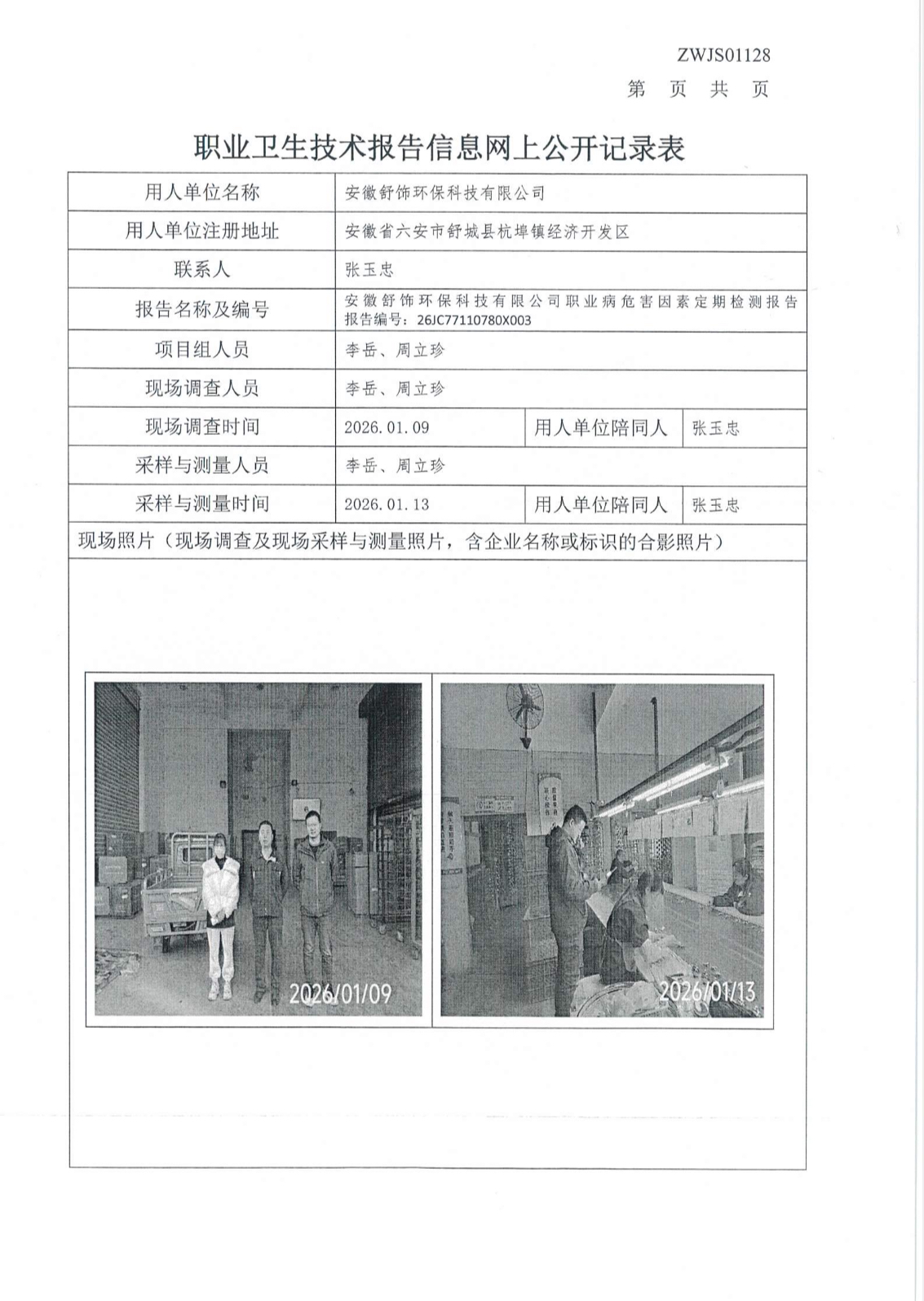 安徽舒饰环保科技有限公司职业病危害因素定期检测报告