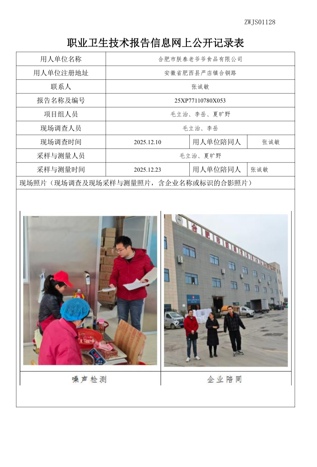 合肥市朕泰老爷爷食品有限公司职业病危害现状评价报告