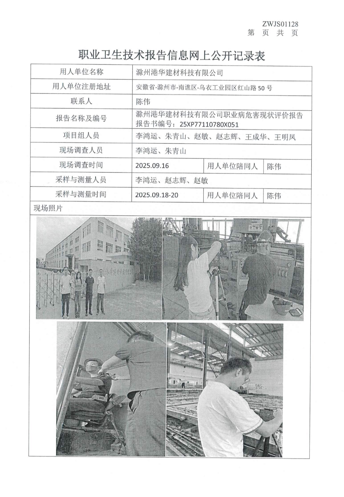 滁州港华建材科技有限公司职业病危害现状评价报告
