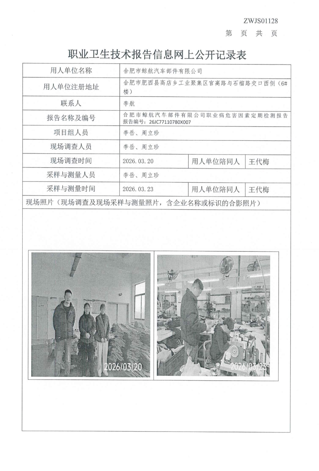 合肥市鲸航汽车部件有限公司职业病危害因素定期检测报告